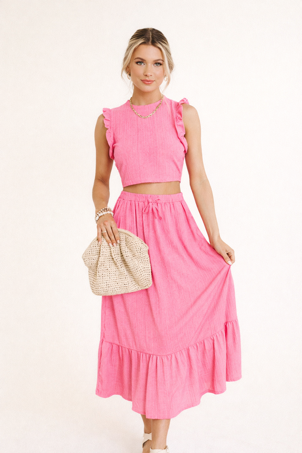 Ein Outfit, mit dem Sie in Sekundenschnelle gut aussehen, wenn Sie einen femininen Look wünschen, der die Blicke auf sich zieht. Das kurze Oberteil und der lange Rock bilden ein komplettes Outfit, das sich gut eignet, wenn Sie auf der Suche nach einem Outfit sind, das aktuell und schmeichelhaft ist. Es ist eine praktische Option, wenn Sie mit einem ausgefeilten Look ausgehen möchten, ohne Zeit mit dem Kombinieren zu verschwenden.
