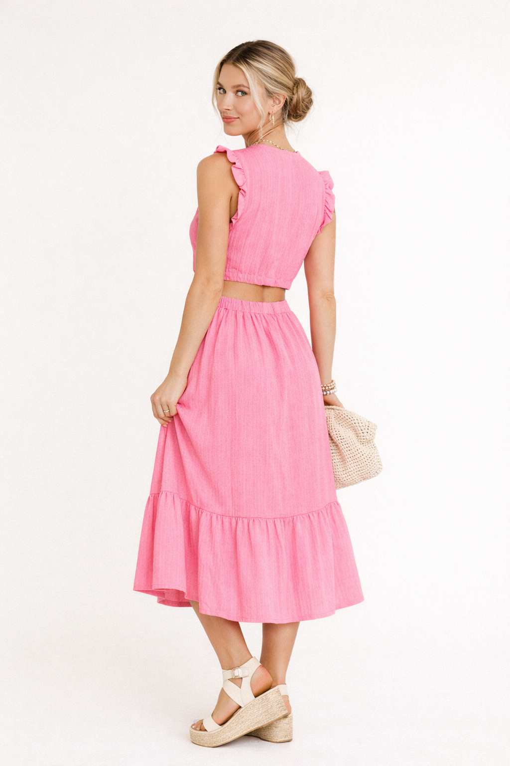 Das ärmellose Oberteil hält das Oberteil leicht, wenn Sie es tragen. Der lange Rock sorgt dank seiner weiten Form für Bewegung beim Gehen. Der elastische Bund sorgt dafür, dass sich das Kleidungsstück leicht an den Körper anschmiegt, während der leichte Stoff dafür sorgt, dass Sie das Outfit stundenlang mit einem angenehmen Gefühl tragen können.