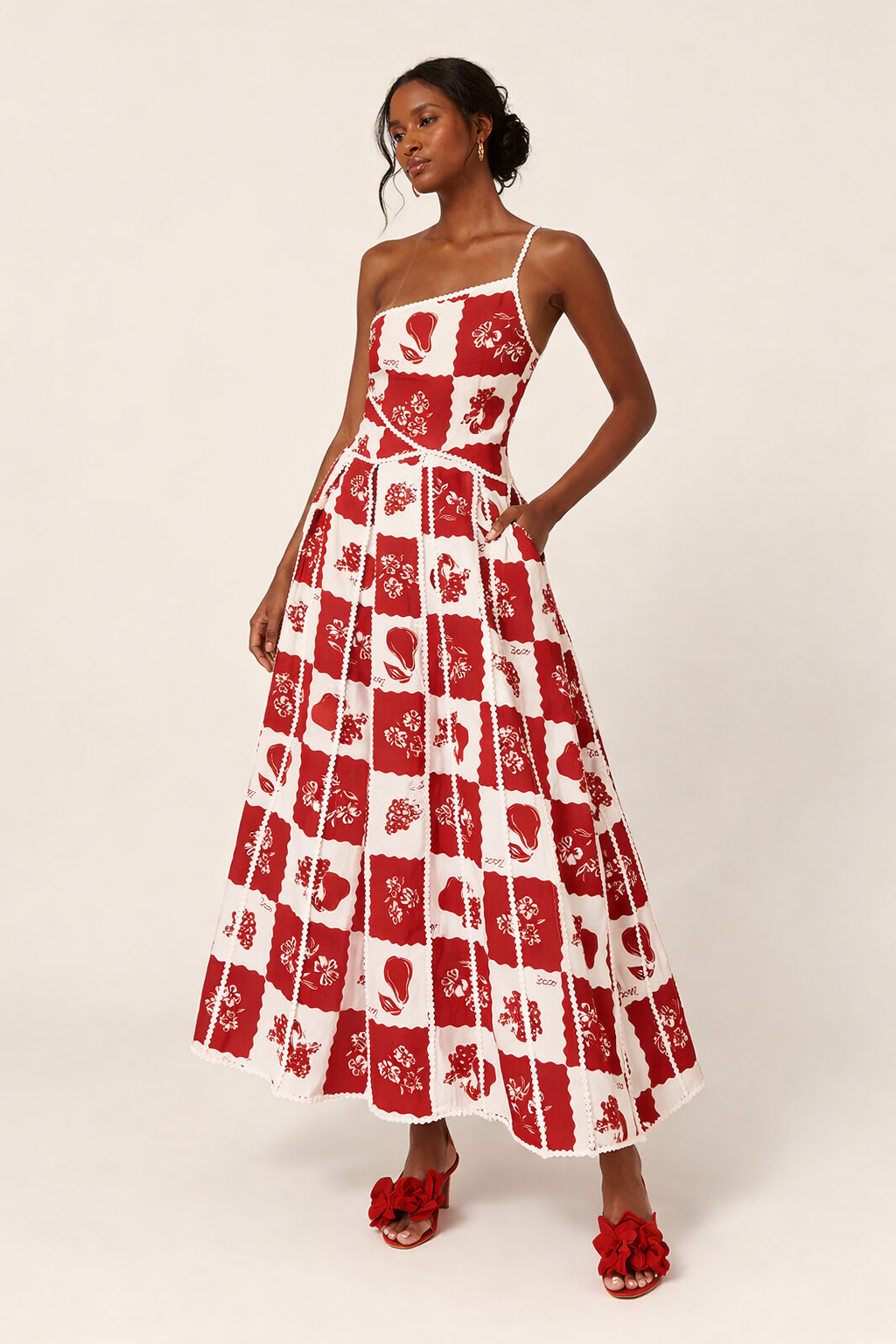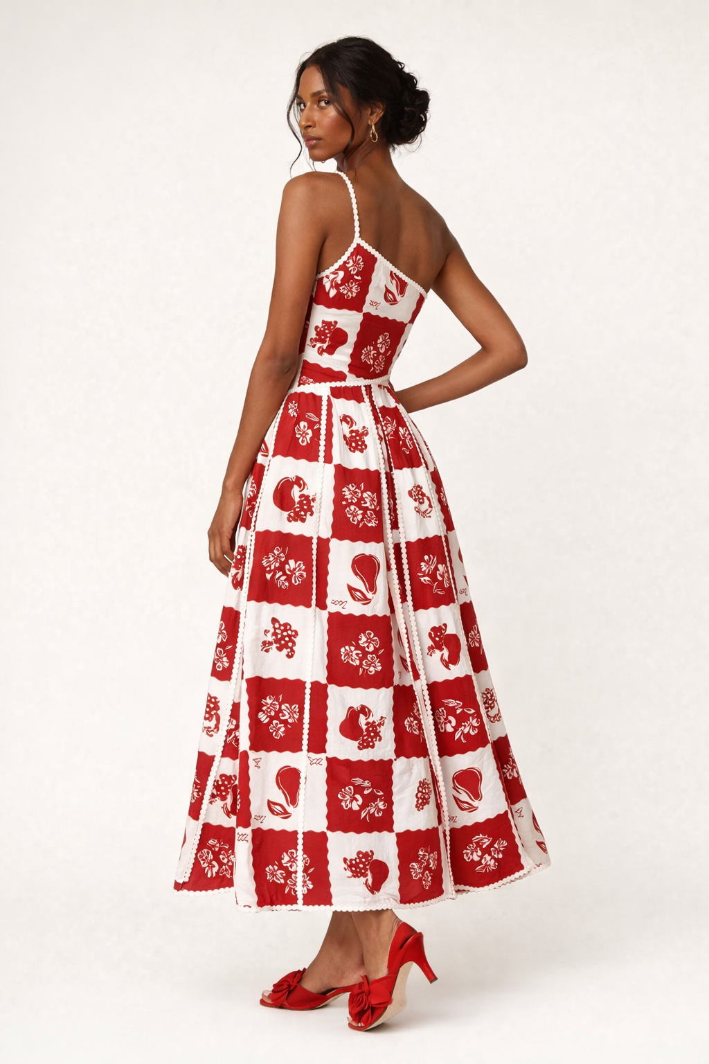 Trauen Sie sich, etwas anderes zu tragen, mit diesem One-Shoulder-Design, das das Oberteil hervorhebt und ihm einen modernen Touch verleiht. Der Blockdruck sorgt für eine gepflegte, auffällige Optik, während das florale Detail an den Rändern für ein besonderes Finish sorgt. Der weite Rock fällt locker und sorgt für einen femininen, gepflegten Look.