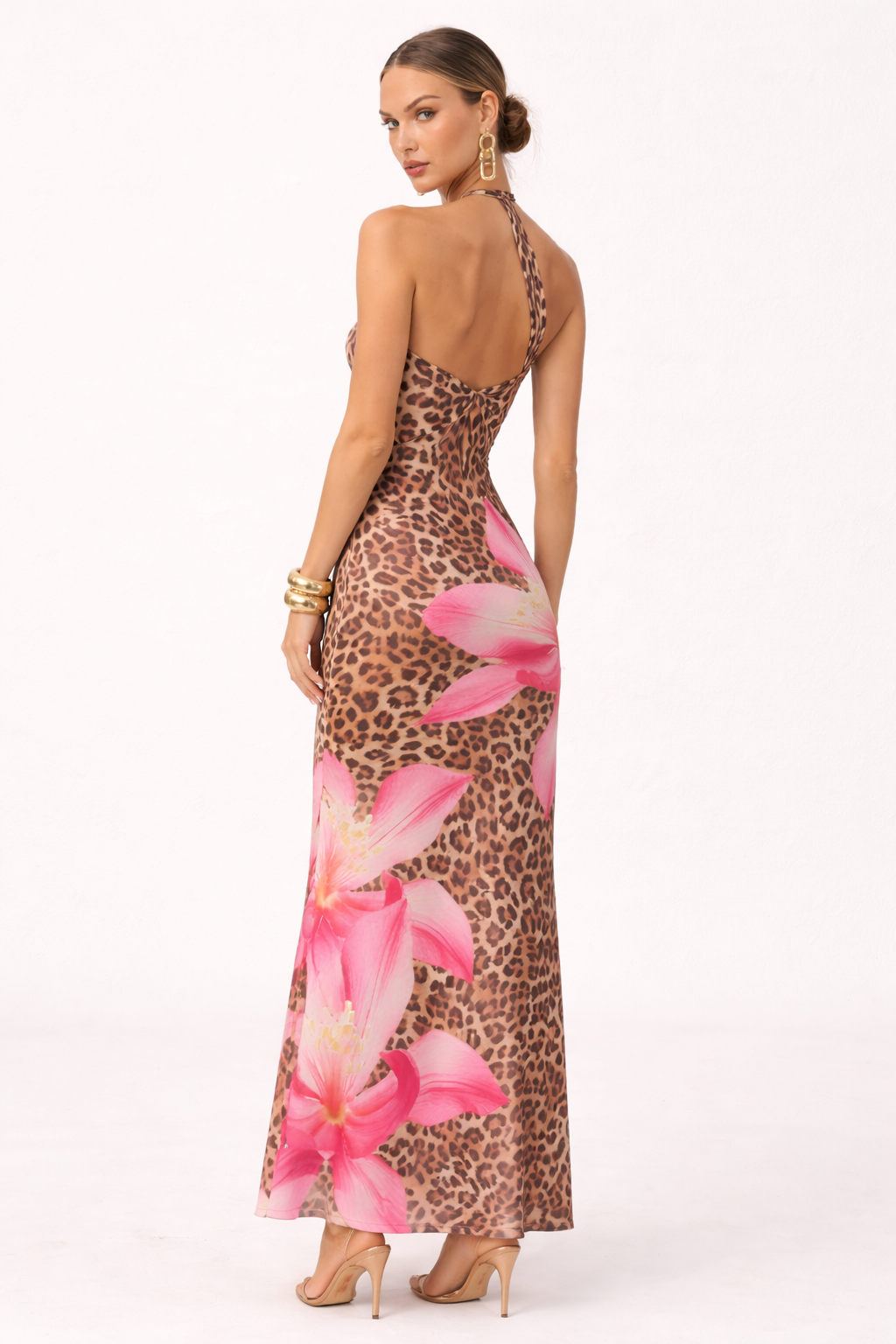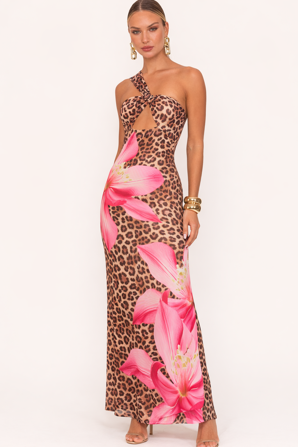 Damen-Maxikleid mit taillierter Silhouette und asymmetrischem Ausschnitt für ein modernes , schlankes Design . Der Druck kombiniert ein Animal-Print-Muster mit übergroßen Blumen und schafft so einen auffälligen Kontrast , der in jedem saisonalenLook auffällt .