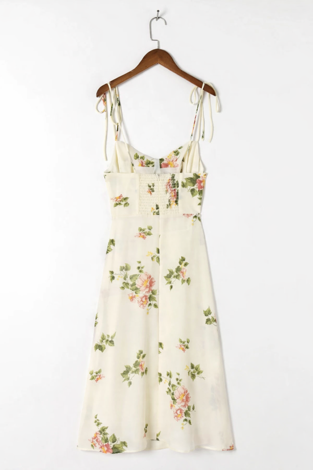 Der Blumendruck verleiht dem Kleid eine romantische und leuchtende Note, die an blühende Gärten erinnert. Der seitliche Schlitz verleiht dem Design Dynamik und ermöglicht mehr Bewegungsfreiheit, wobei das Gleichgewicht zwischen Raffinesse und Natürlichkeit gewahrt wird. Der definierte Bund strukturiert die Figur, ohne sie zu versteifen, und begünstigt eine schlanke Silhouette.