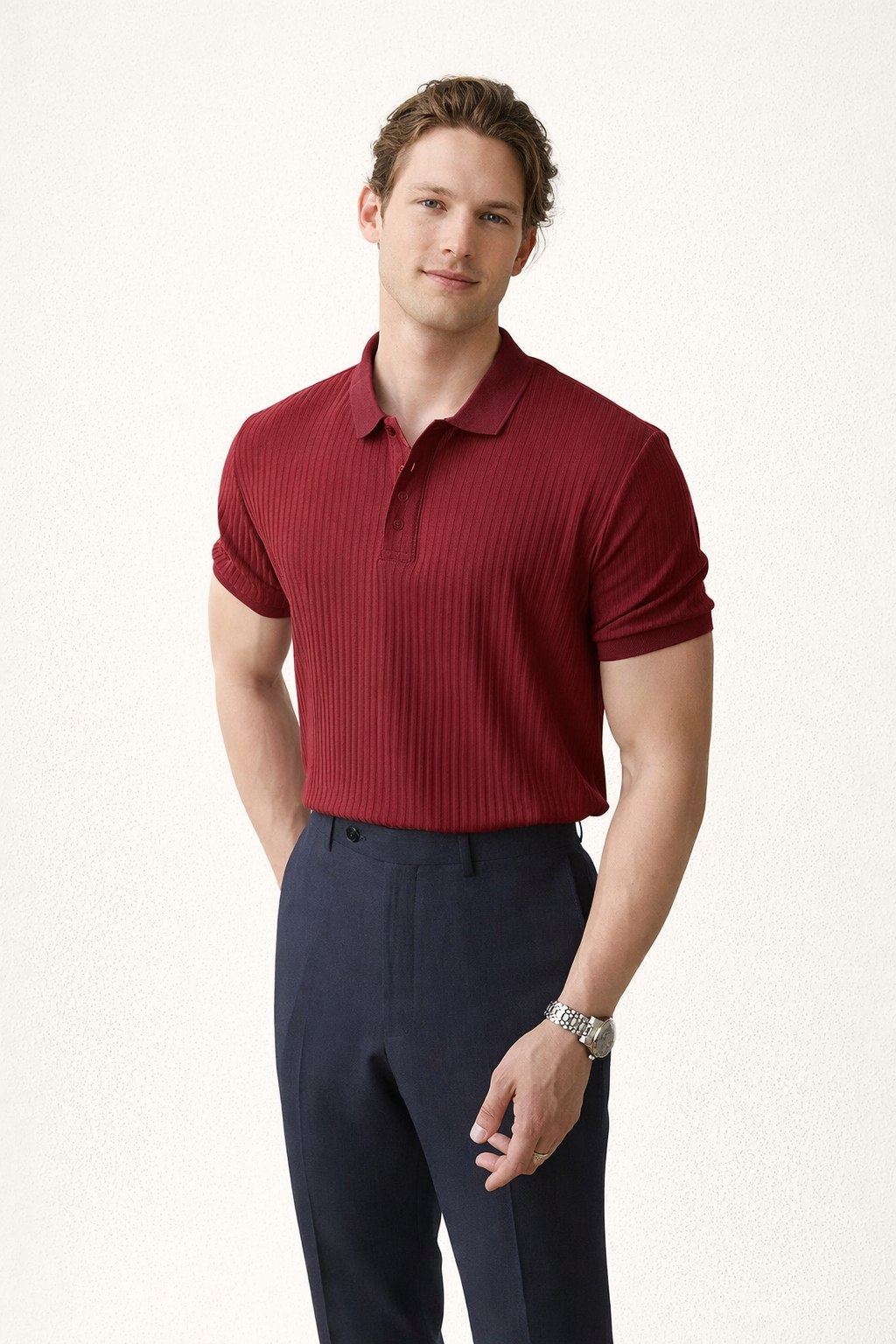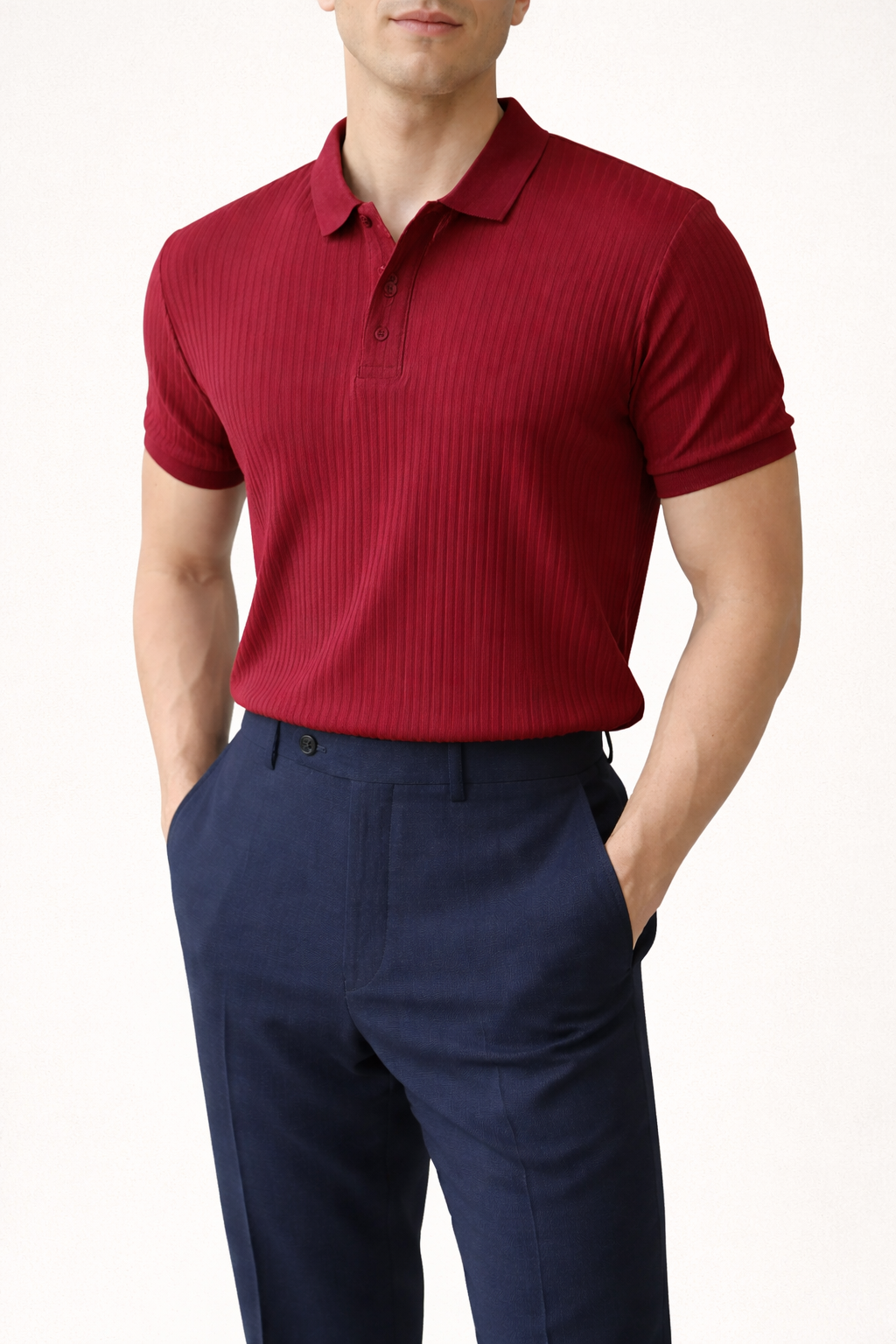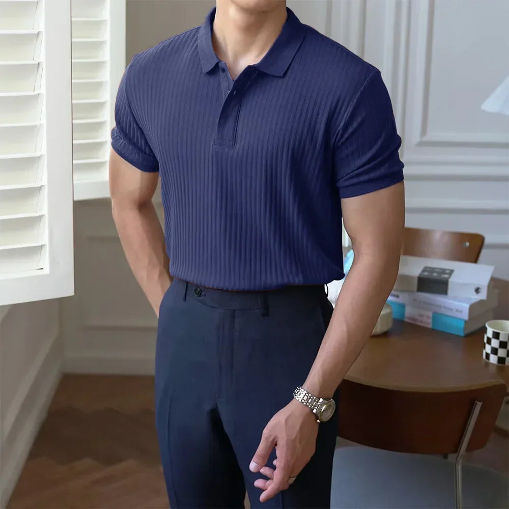 Dieses Poloshirt wurde für Männer entworfen, die ein Kleidungsstück suchen, das den Oberkörper besser definiert, und bietet eine klare Alternative zu schlichten T-Shirts. Der vertikal strukturierte Stoff lässt das Kleidungsstück selbstbewusster und durchsetzungsfähiger wirken und hält das Outfit auch bei einfachen Kombinationen in Form.