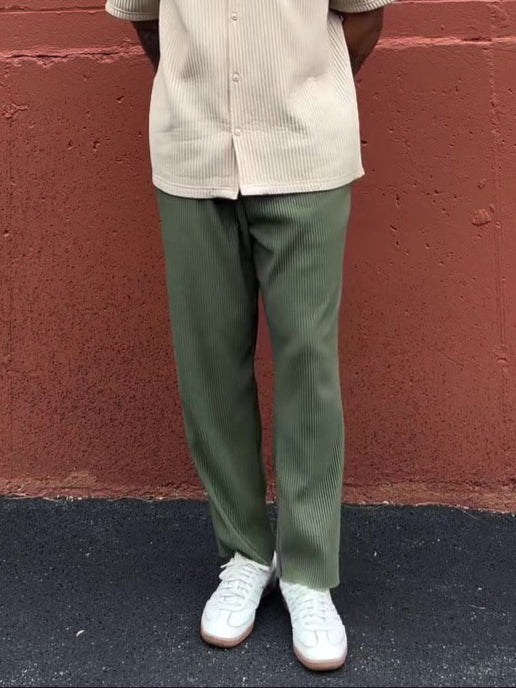 Diese gerippte Hose für Herren bietet eine moderne Ästhetik mit einer bequemen, entspannten Passform. Das gerade, fließende Design bietet Bewegungsfreiheit, ohne auf Eleganz zu verzichten, und macht sie zu einem Schlüsselstück für eine moderne Garderobe.