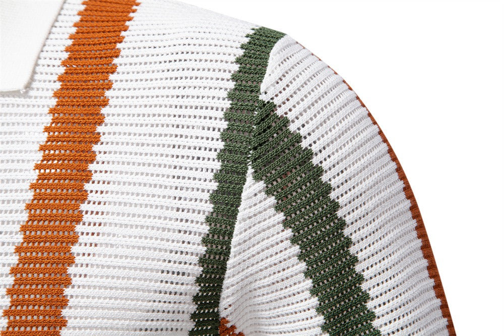 Dieses kurzärmelige Poloshirt mit Retro-Charakter und modernem Design zeichnet sich durch eine Rippenstrickkonstruktion und ein kontrastierendes vertikales Streifenmuster aus. Der klassische knopflose Kragen unterstreicht den entspannten, raffinierten Stil, ideal für alle, die Charakter und Vielseitigkeit suchen.