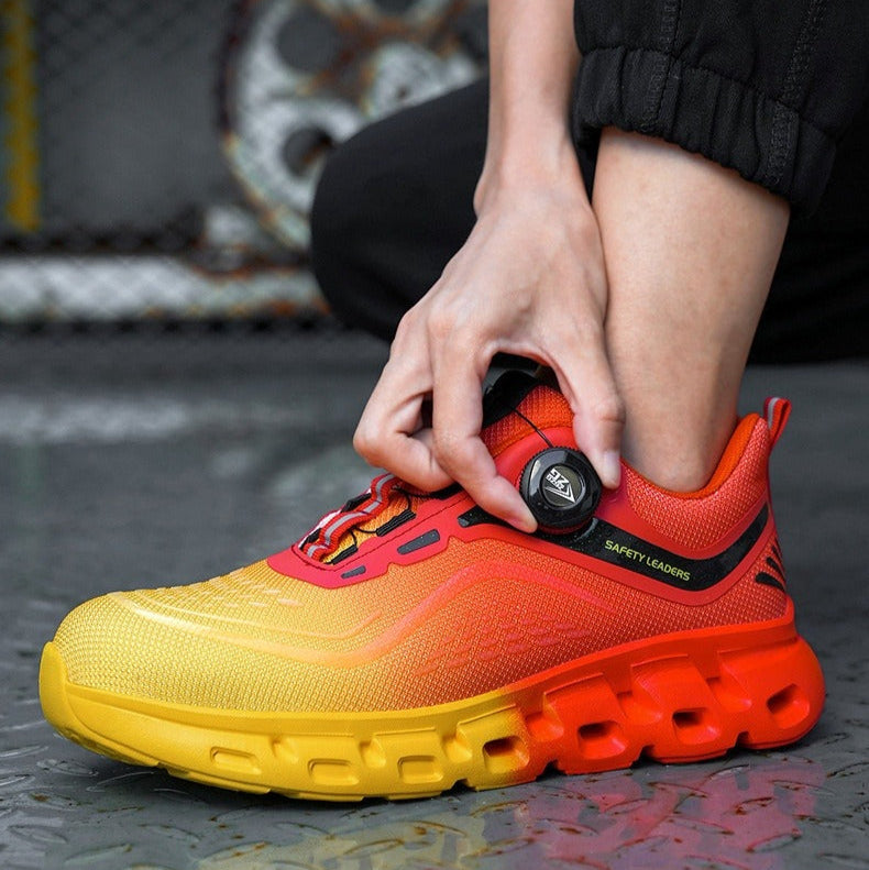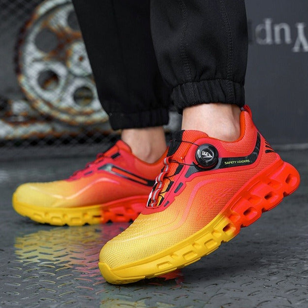 Diese Sicherheitsschuhe kombinieren Industrieschutz mit einem modernen, sportlichen Design in Rot- und Gelbtönen mit Farbverlauf. Sie sind aus strapazierfähigen Materialien gefertigt, die Sicherheit gegen Stöße, Durchstiche und langes Tragen in anspruchsvollen Umgebungen bieten.