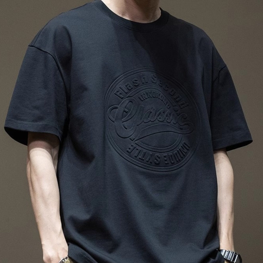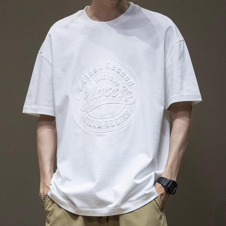 Es ist aus weicher, hochverdichteter Baumwolle gefertigt und verfügt über einen monochromen Prägedruck auf der Brust, der für zusätzliche Textur und visuelle Tiefe sorgt. Der übergroße Schnitt mit überschnittenen Schultern sorgt für Bewegungsfreiheit und eine moderne Ästhetik.