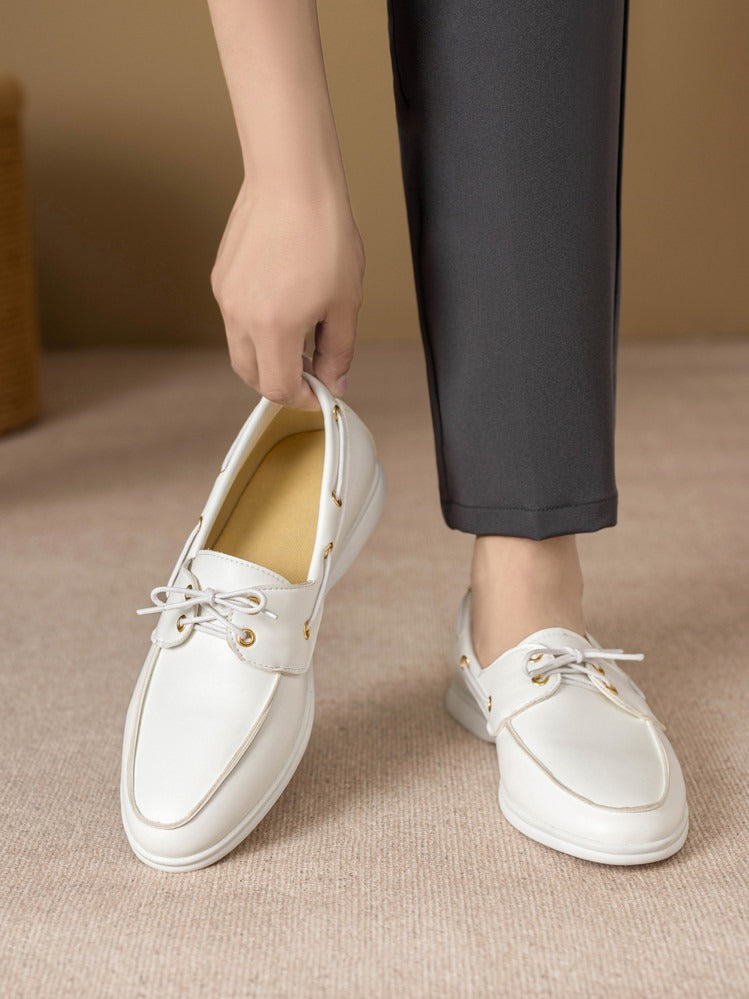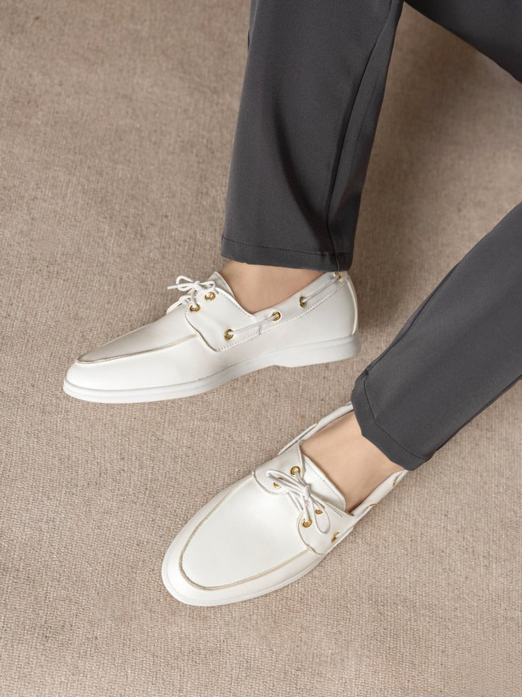 Mokassins für Herren aus mattem Kunstleder mit schlichtem, minimalistischem Design. Die dekorative Schnürung mit goldfarbenen Metallösen verleiht dem Schuh einen raffinierten maritimen Touch, perfekt für raffinierte Sommerlooks.