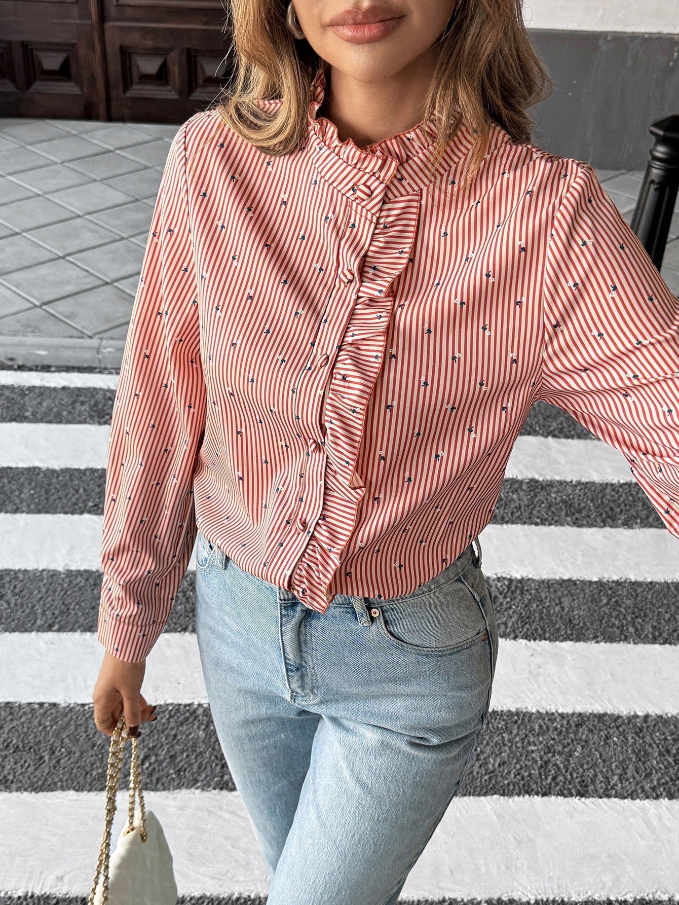 Der hohe Kragen und die zarten Rüschen auf der Vorderseite verleihen ihr eine romantische und raffinierte Note, während das Streifenmuster und die kleinen gedruckten Details für optische Dynamik sorgen.