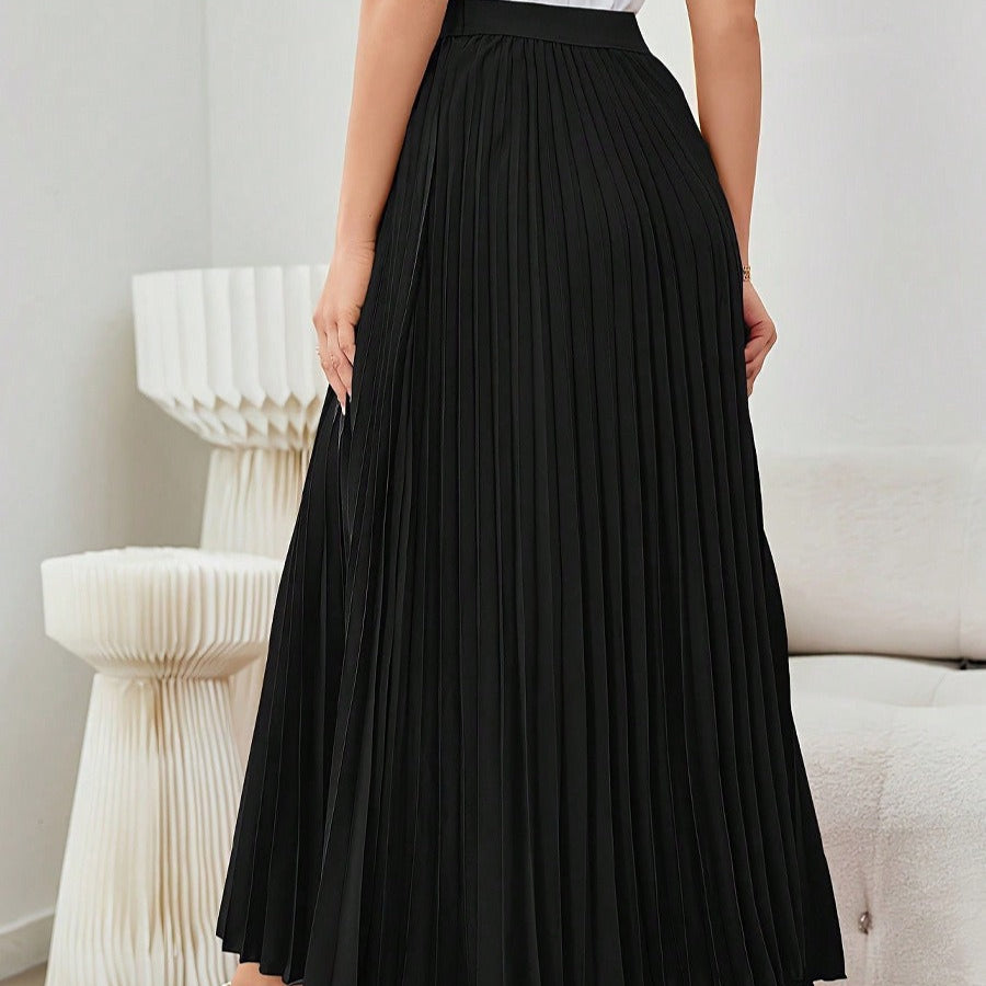 Dieser lange Faltenrock für Damen zeichnet sich durch einen fließenden Fall und eine optisch dynamische Struktur aus, ideal für alle, die ein Gleichgewicht zwischen Komfort und Stil schätzen. Der Rock mit hoher Taille verschlankt die Figur und kann je nach Anlass mit einfachen T-Shirts oder formellen Blusen getragen werden.